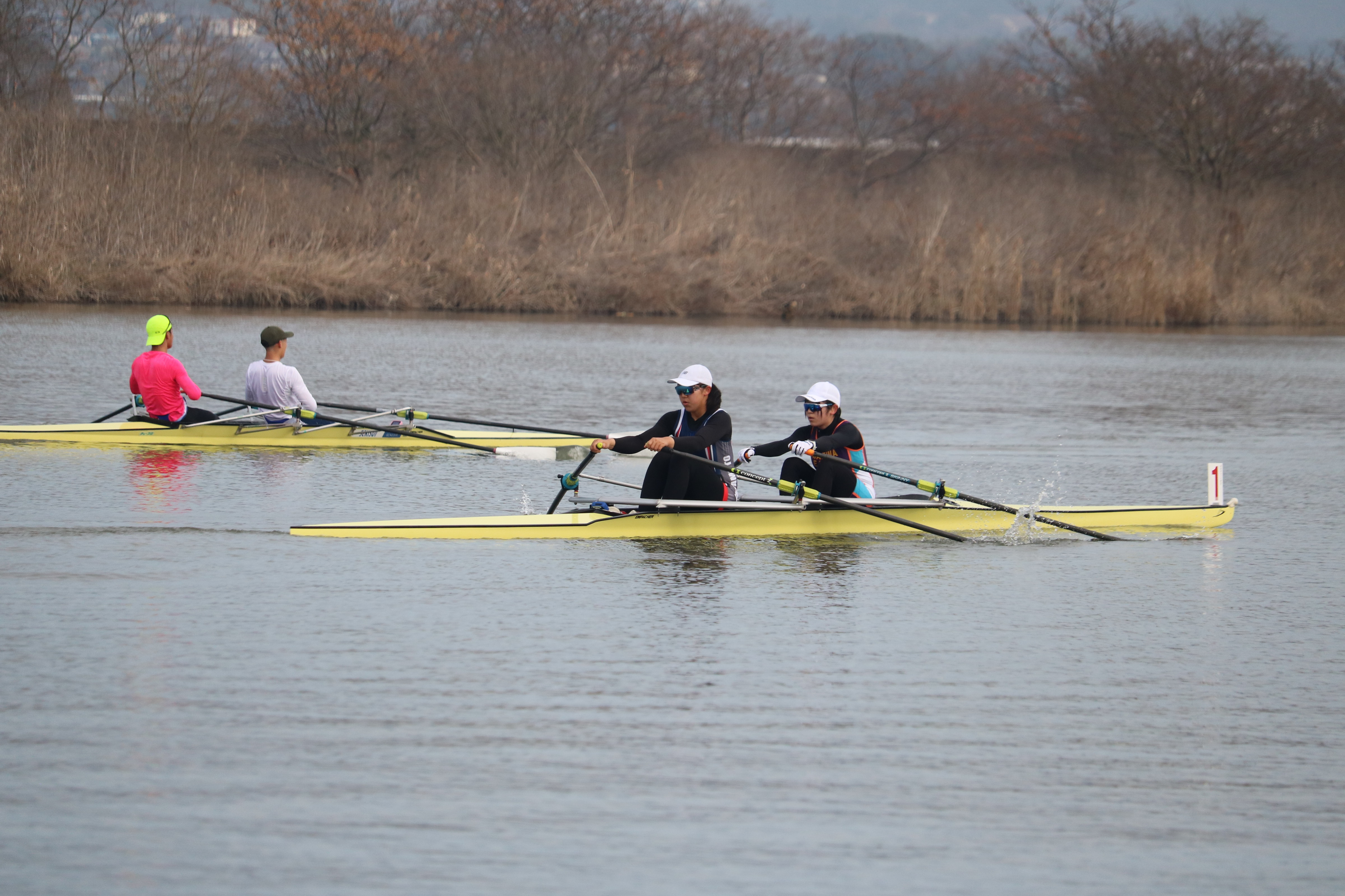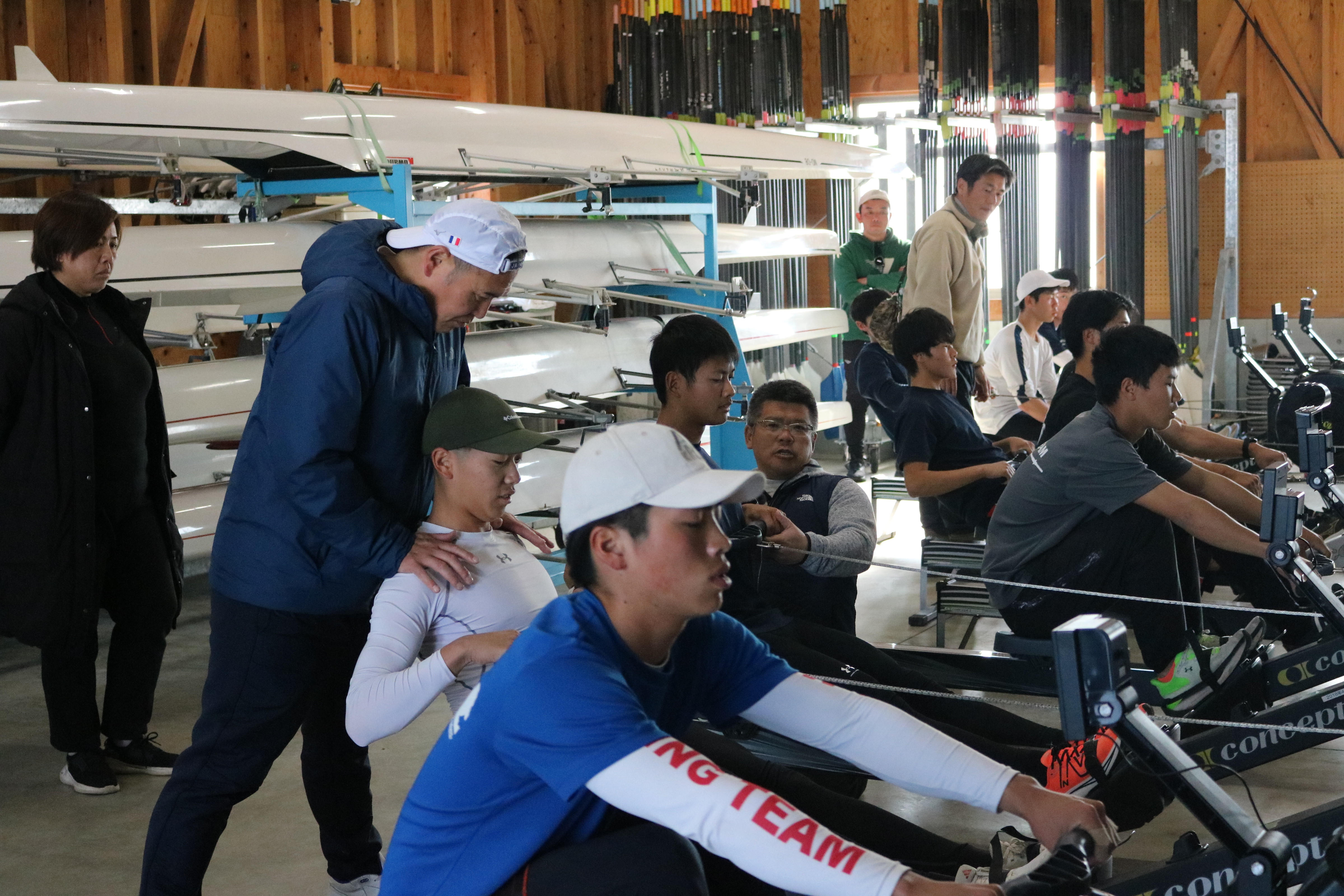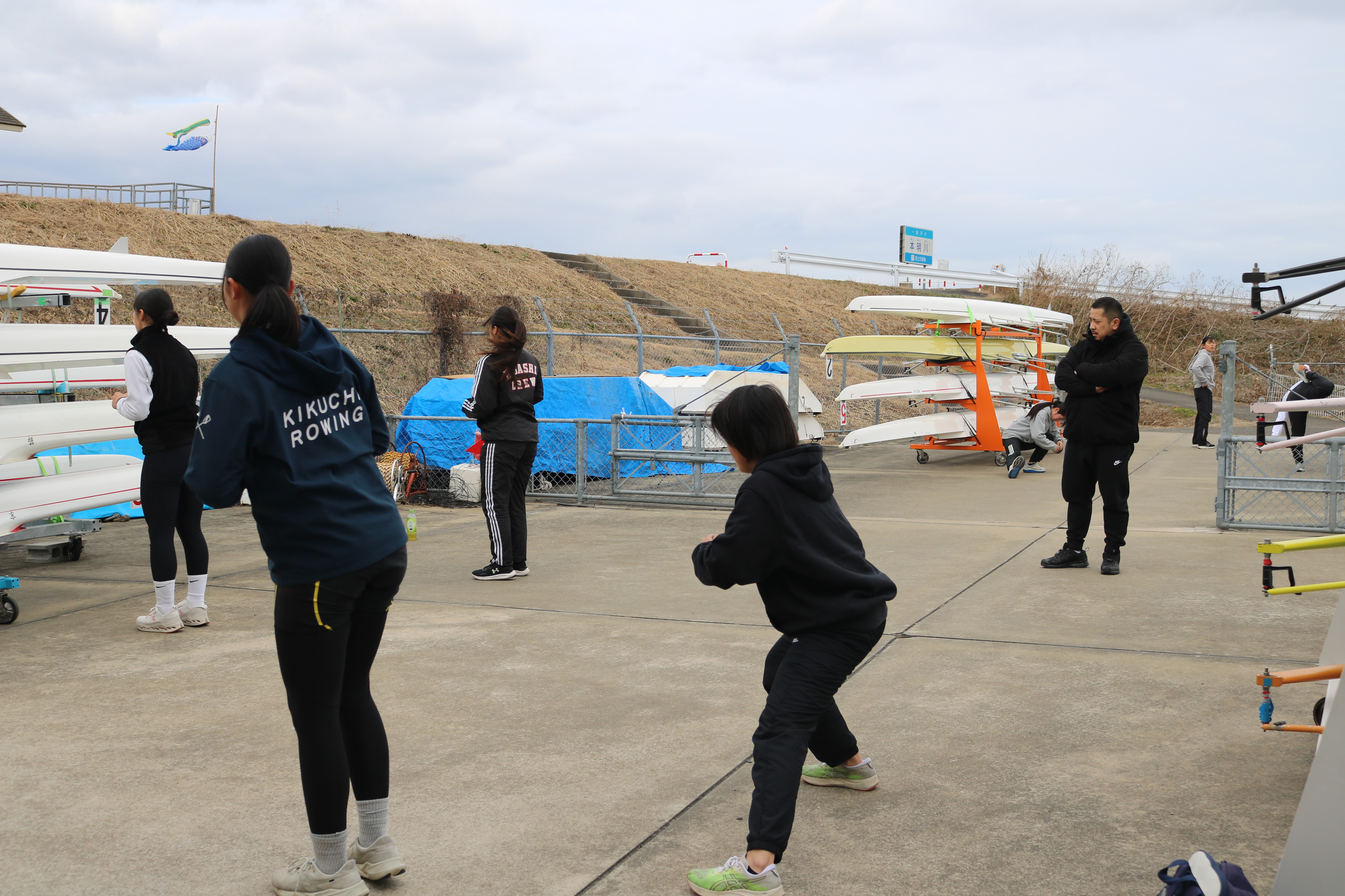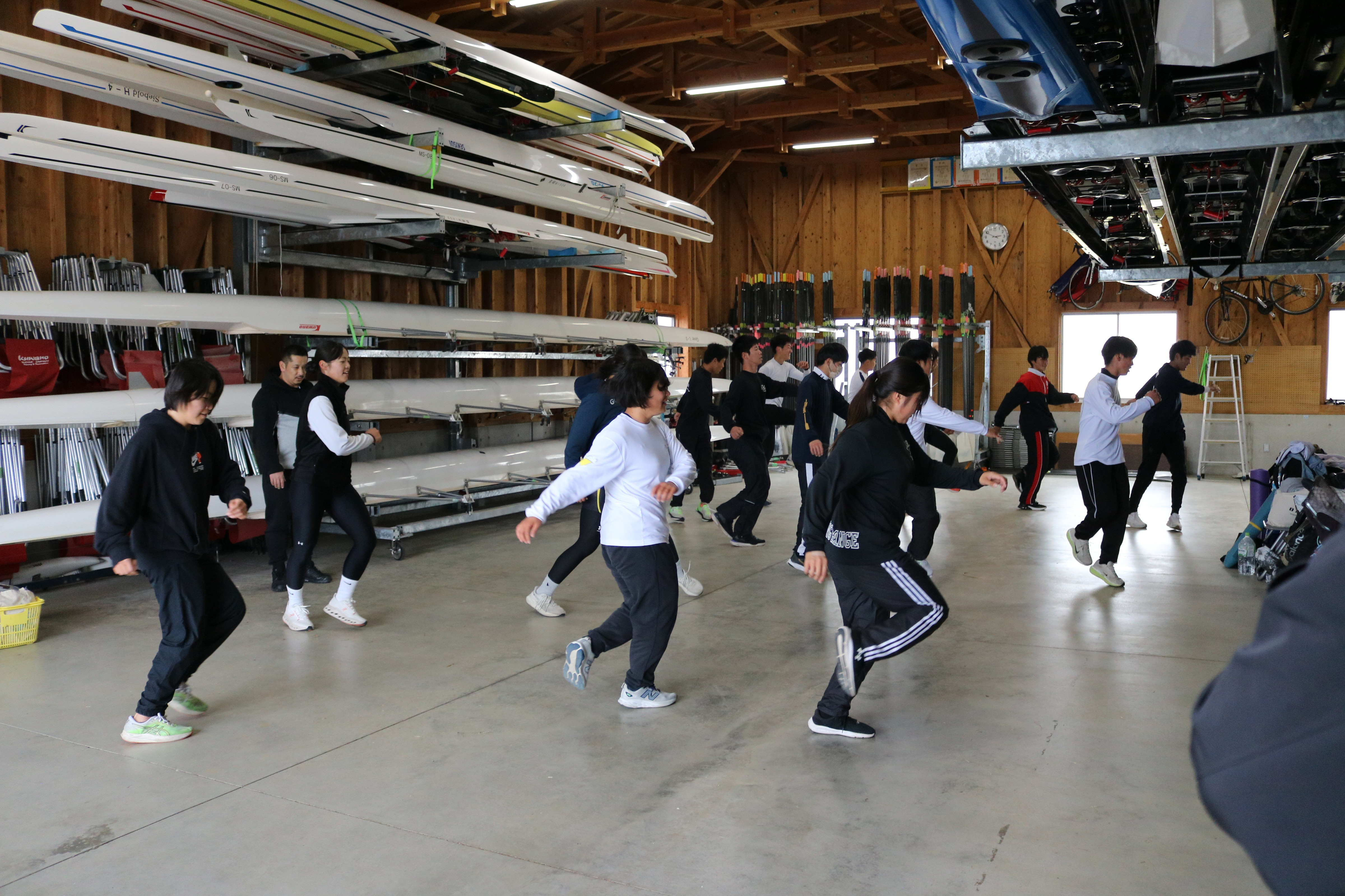 19日は前日と同じく暖かい気候の中で練習がスタート。今回はダブルスカルでのトレーニングということもあり、ミーティングでは「ふねを感じる」ことの重要性について指導を受けました。テクニカル面、特にファイナルの動きをエルゴで確認した後、乗艇でのドリルやスキルアップに取り組みました。