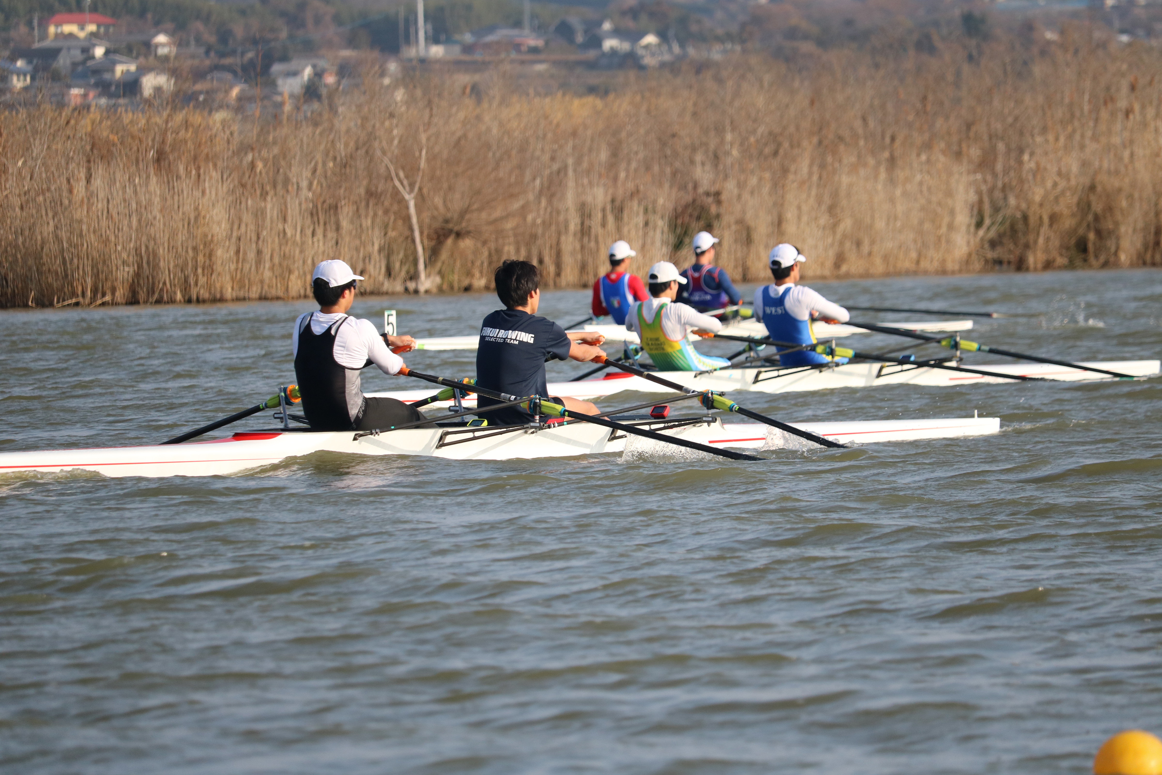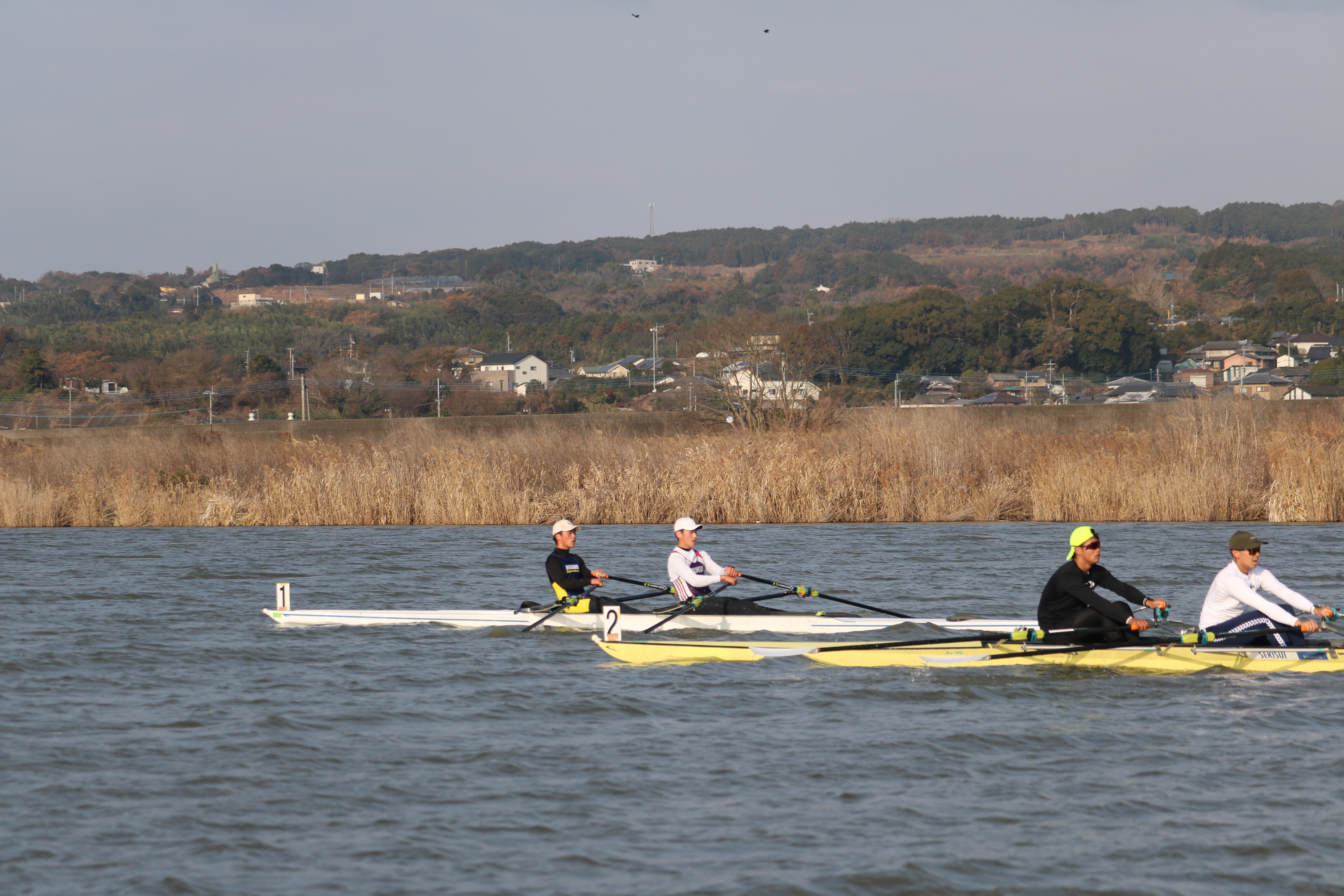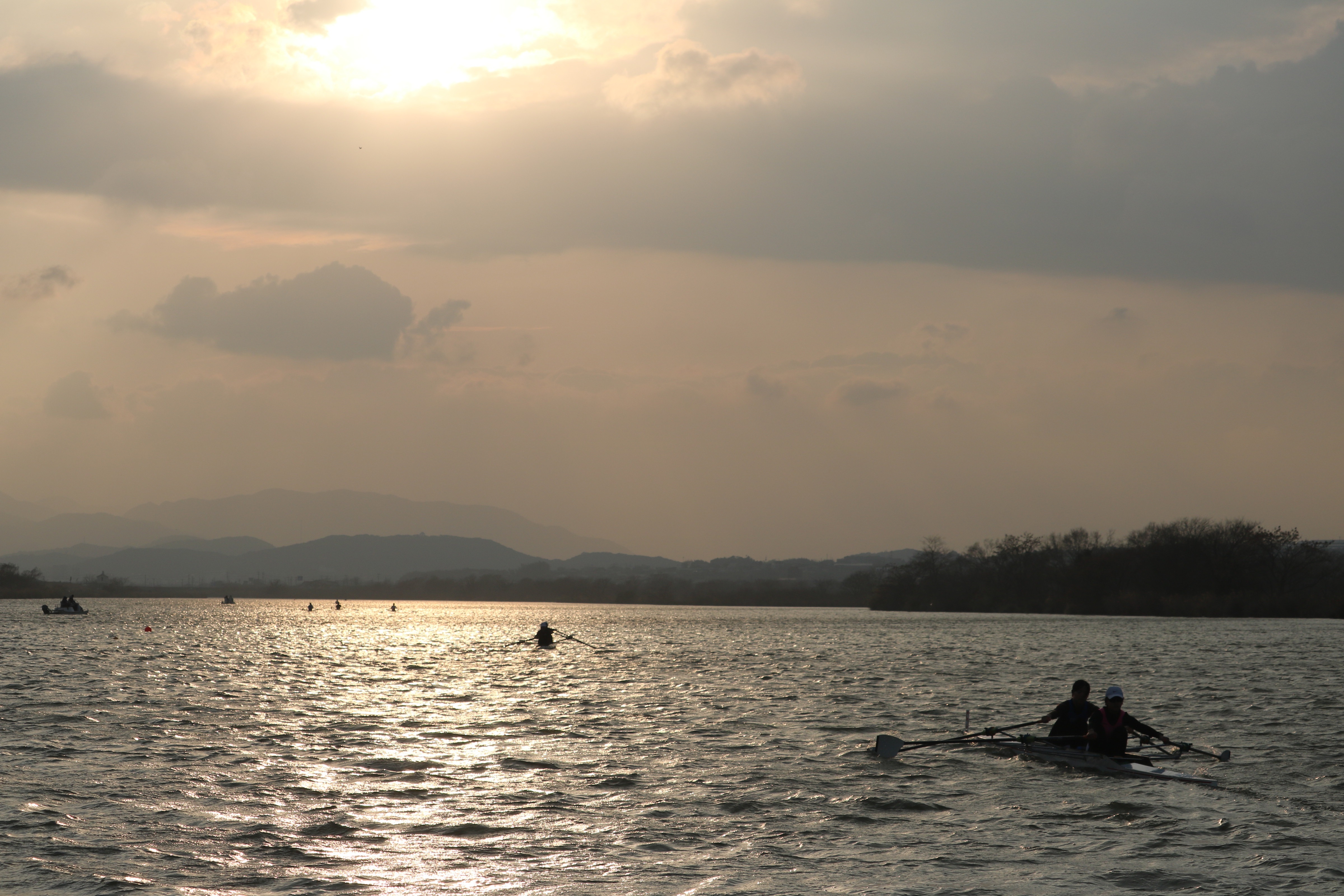 19日は前日と同じく暖かい気候の中で練習がスタート。今回はダブルスカルでのトレーニングということもあり、ミーティングでは「ふねを感じる」ことの重要性について指導を受けました。テクニカル面、特にファイナルの動きをエルゴで確認した後、乗艇でのドリルやスキルアップに取り組みました。