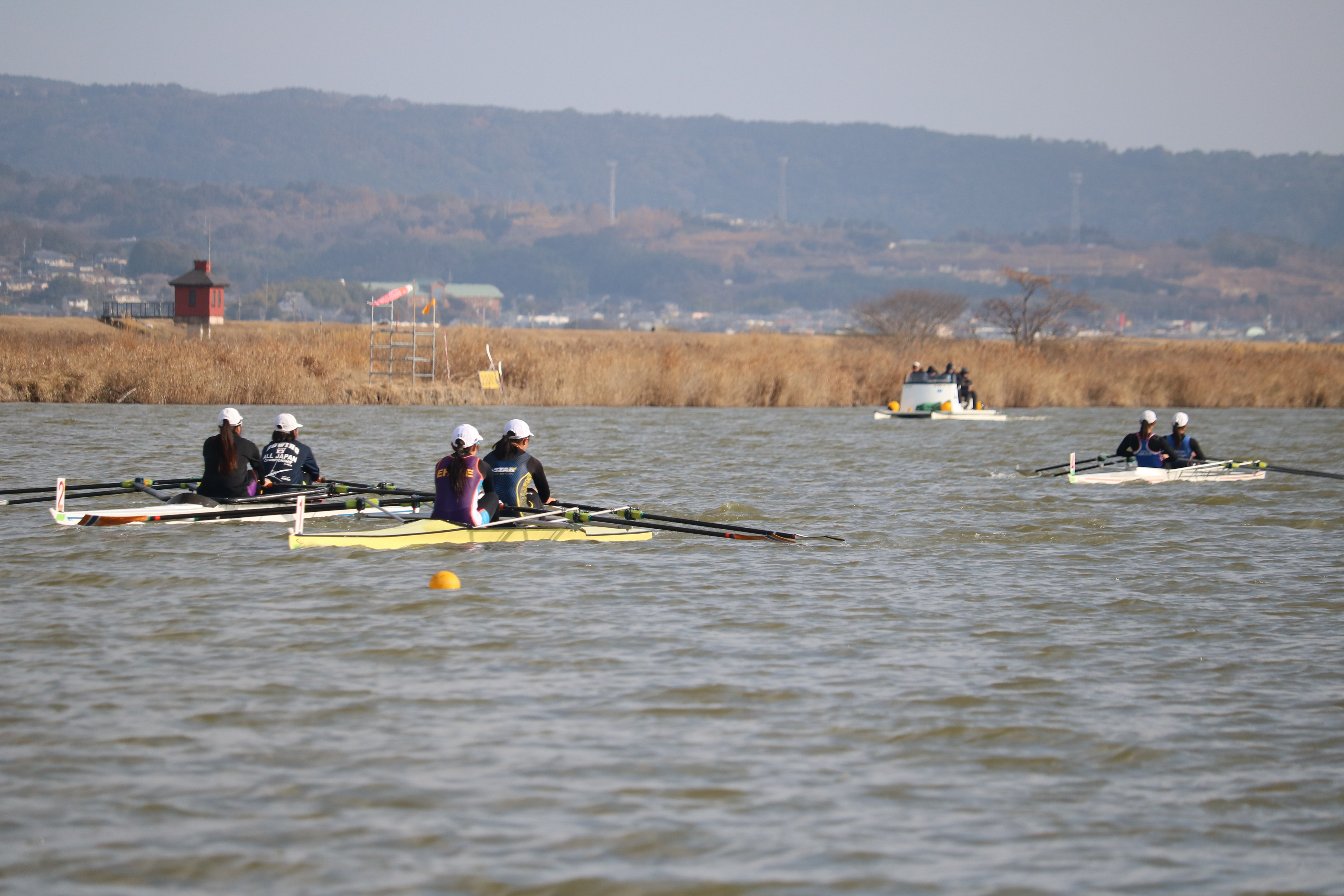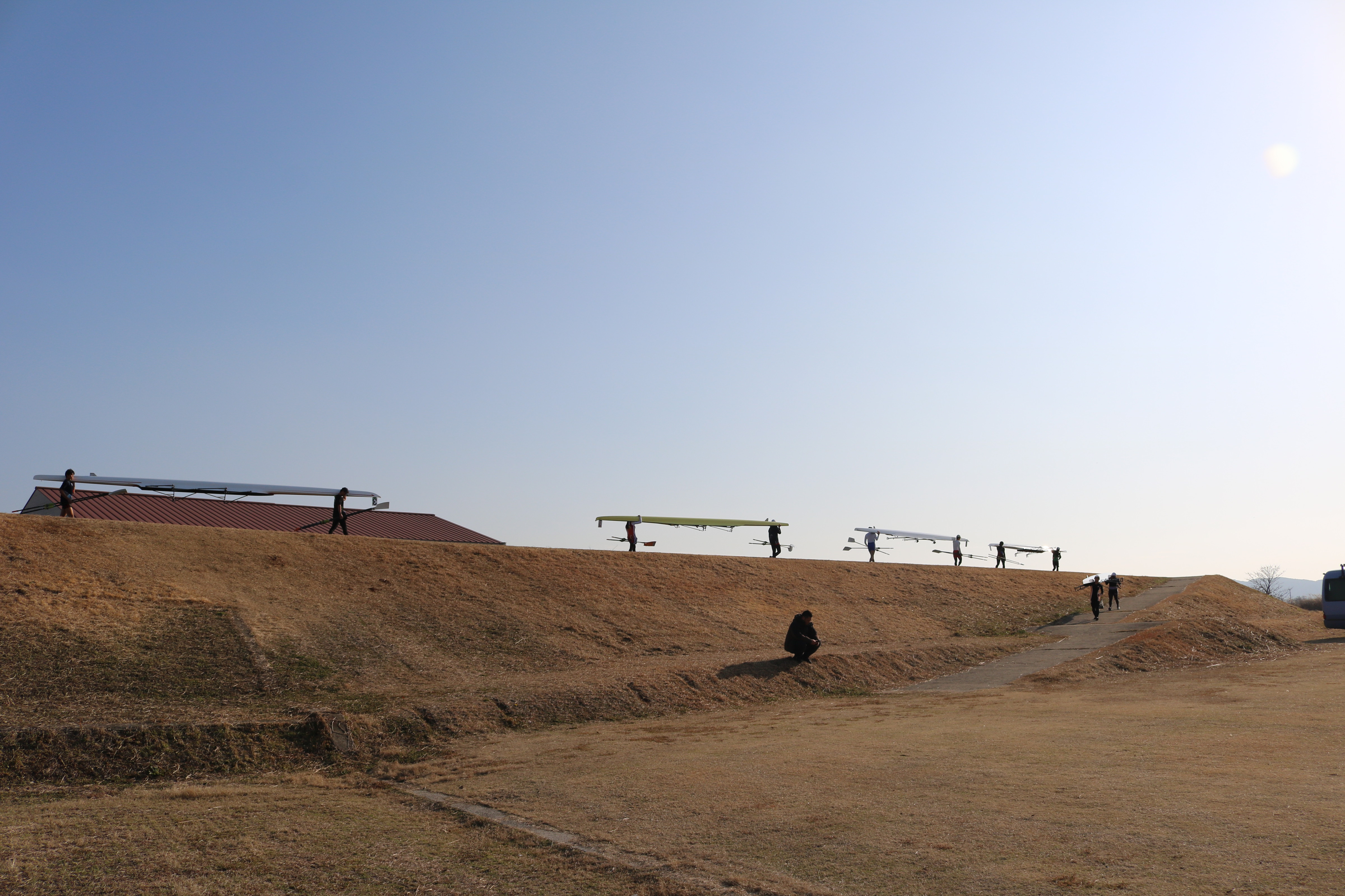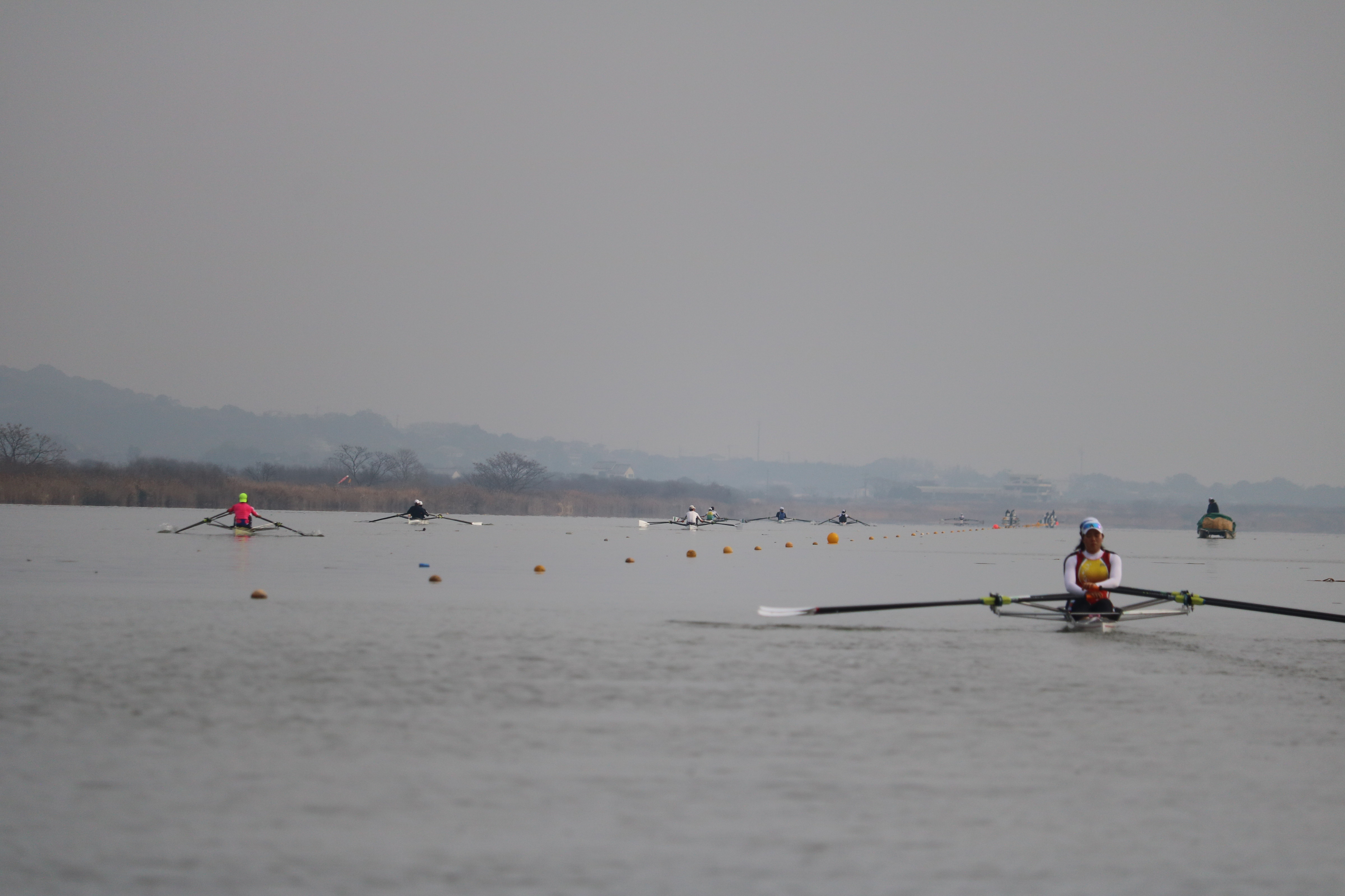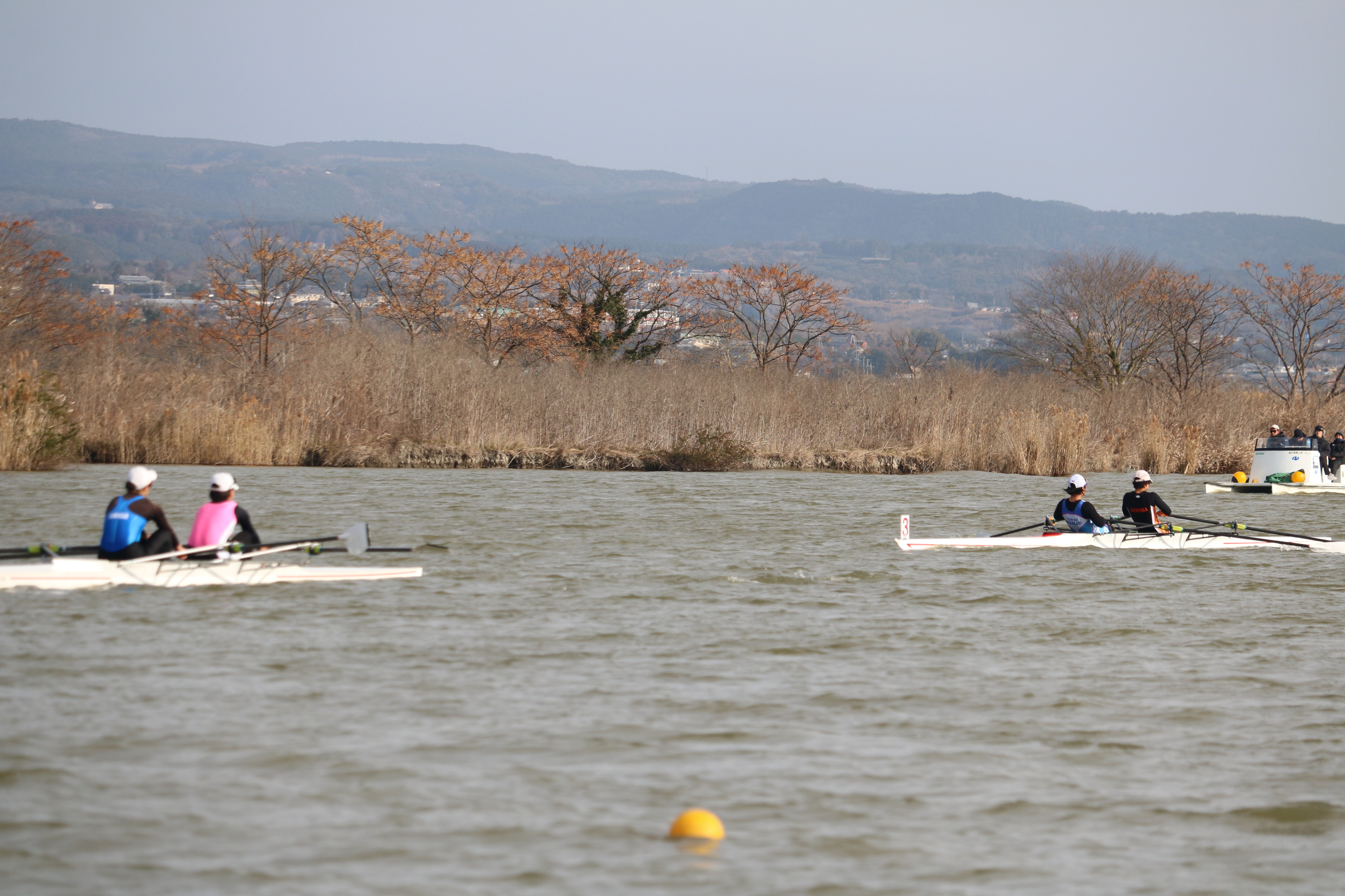 19日は前日と同じく暖かい気候の中で練習がスタート。今回はダブルスカルでのトレーニングということもあり、ミーティングでは「ふねを感じる」ことの重要性について指導を受けました。テクニカル面、特にファイナルの動きをエルゴで確認した後、乗艇でのドリルやスキルアップに取り組みました。