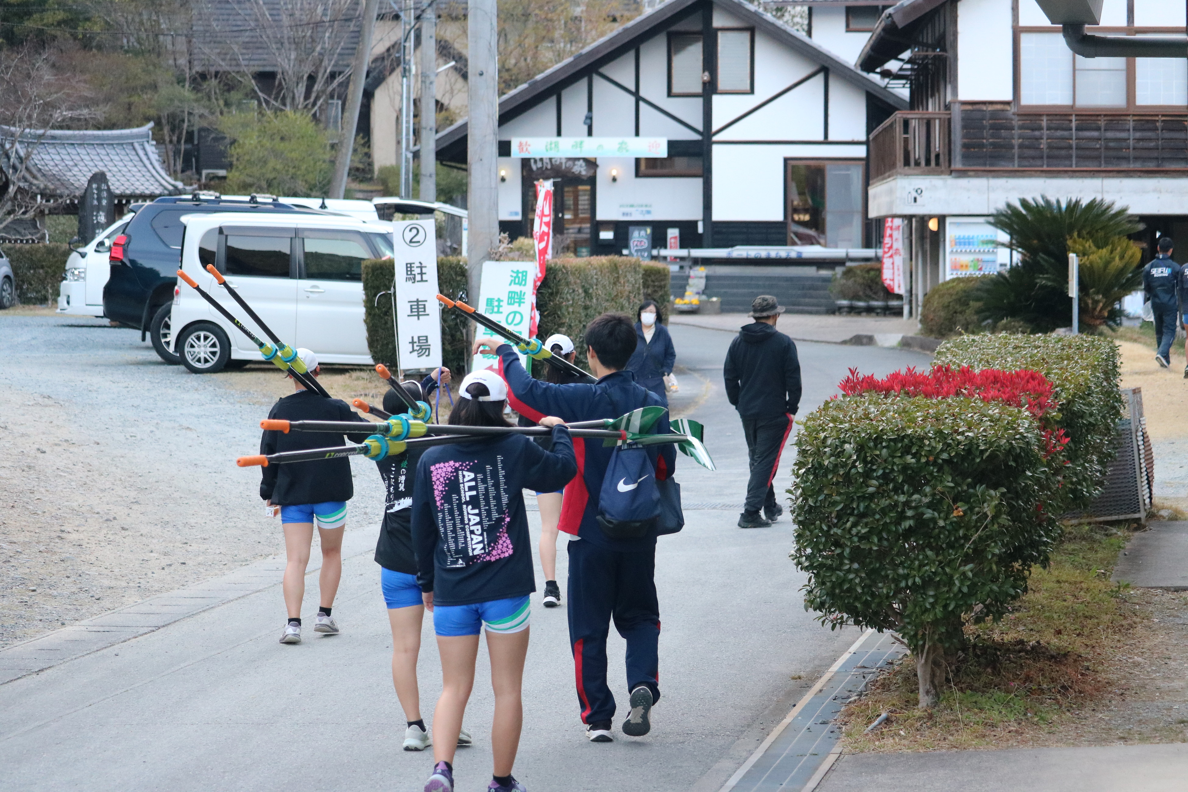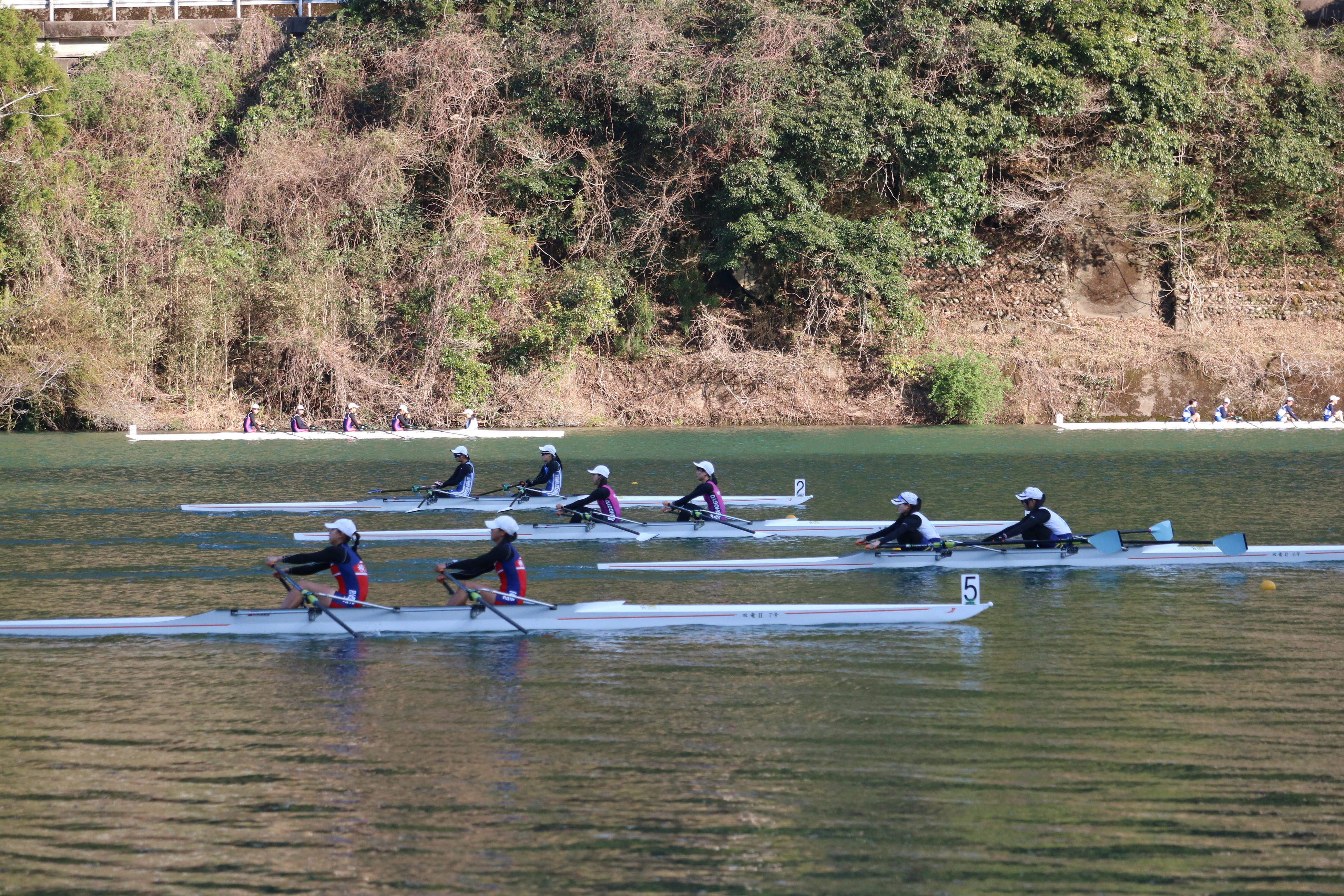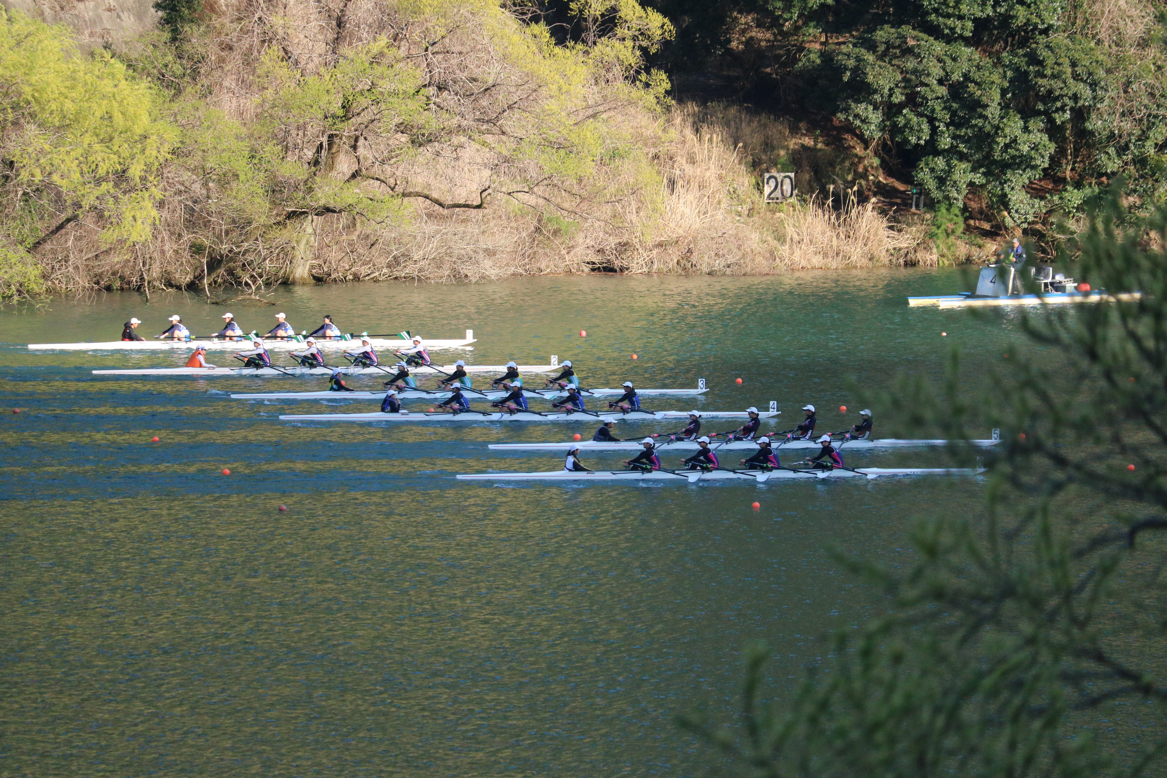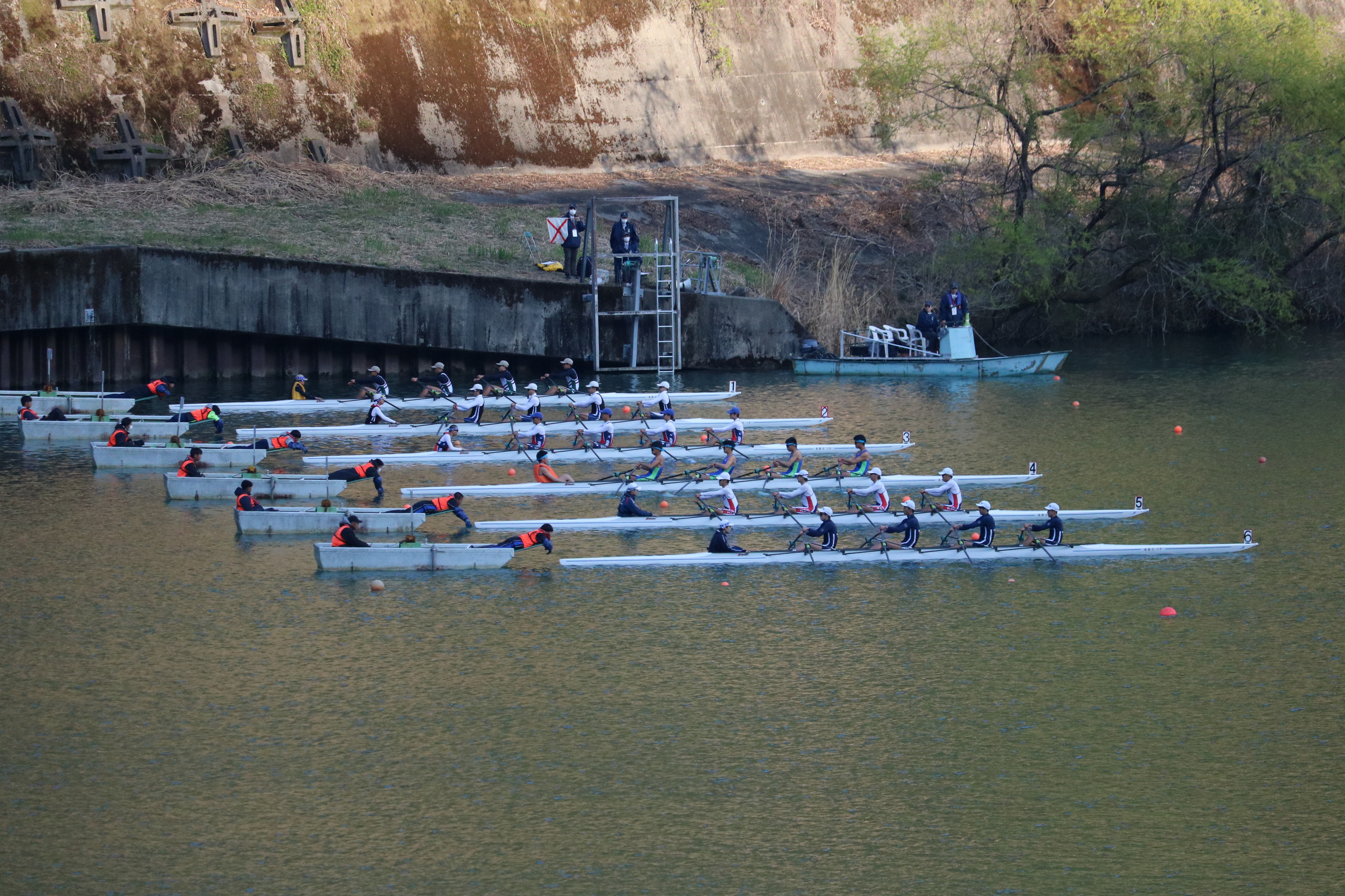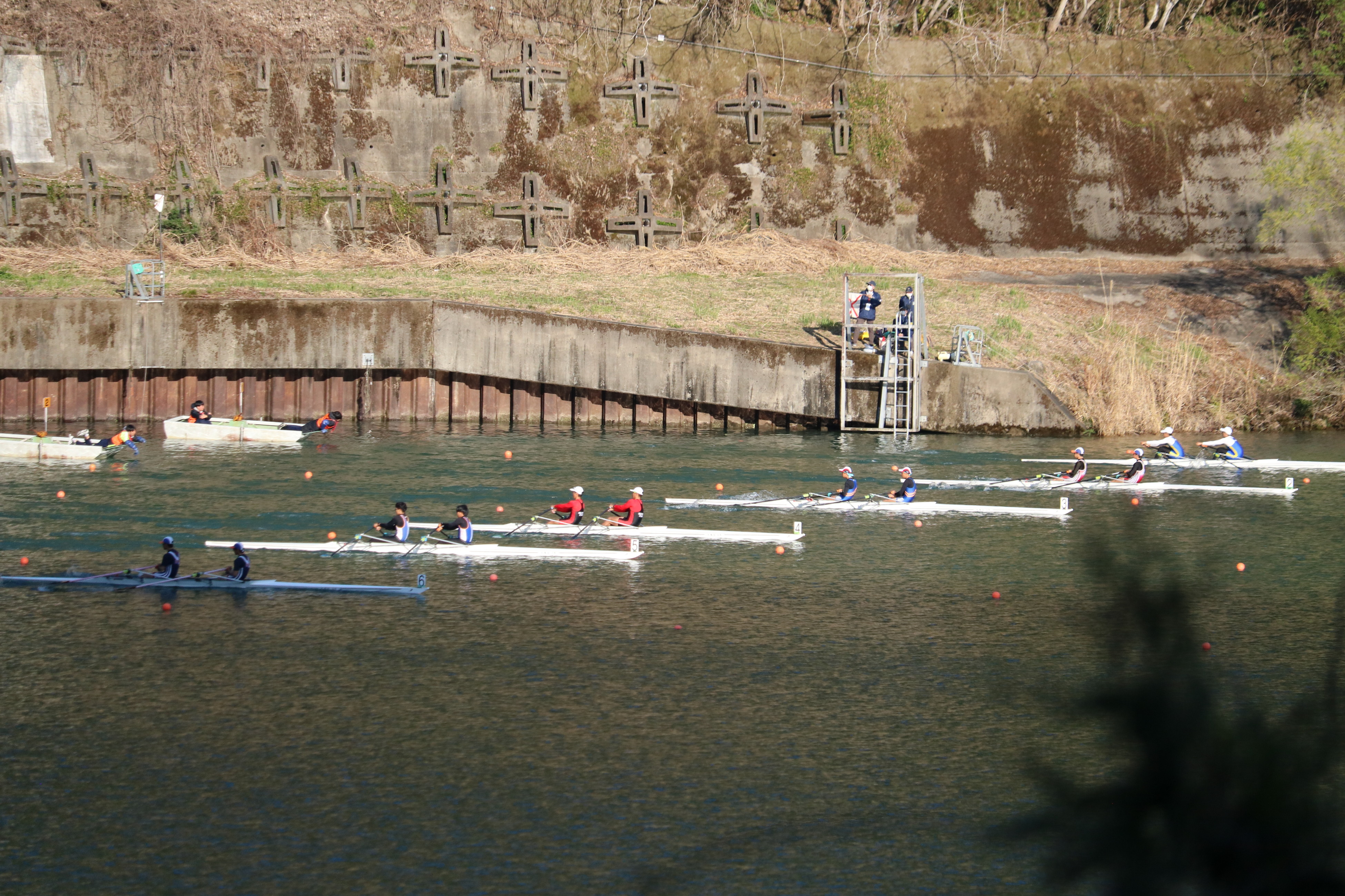 本日は春らしい穏やかな陽気に恵まれ、選手たちにとっては暑さを感じるほど。水面は、昼前後に一時白波が立つほどの風が吹く場面もありましたが、選手たちは高い集中力で対応していました。午前中の「生き残りをかけた」敗者復活戦では白熱した展開が続き、その熱気は午後の準決勝へと引き継がれました。激戦を勝ち抜いたクルーは、明日の決勝または順位決定戦への切符を手にしています。明日はいよいよ最終日。全国の頂点を決める戦いが始まります!以下は本日の様子です。